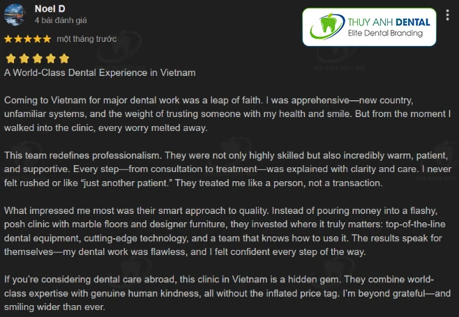 The authentic reviews from international patients demonstrate that Thuy Anh Dental not only excels in technology and clinical expertise but also provides a comfortable, transparent, and effective treatment experience. If you are looking for a trustworthy dental clinic in Vietnam, Thuy Anh is undoubtedly a top choice for any international patient.