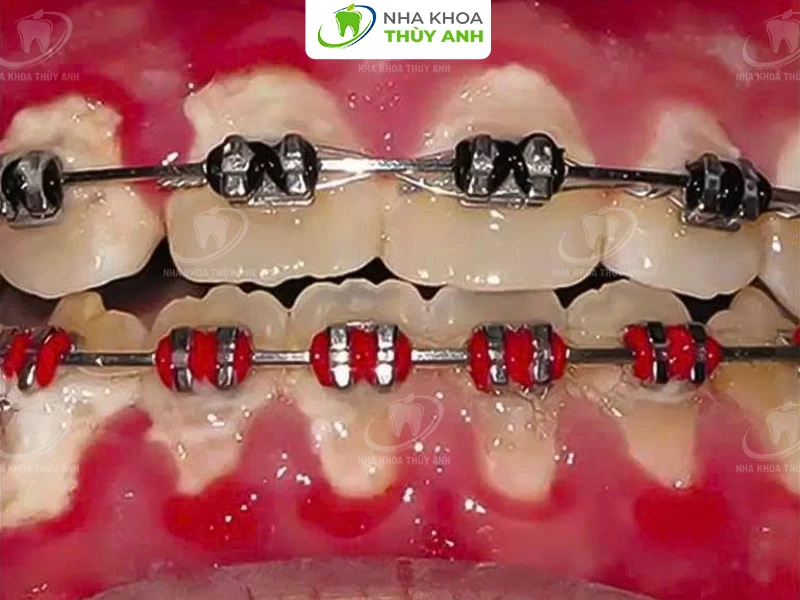 - Vệ sinh răng miệng không hiệu quả: Mắc cài và dây cung tạo nhiều khe hẹp khiến bàn chải thông thường không làm sạch triệt để. Mảng bám tích tụ lâu ngày sẽ kích thích phản ứng viêm ở mô lợi.